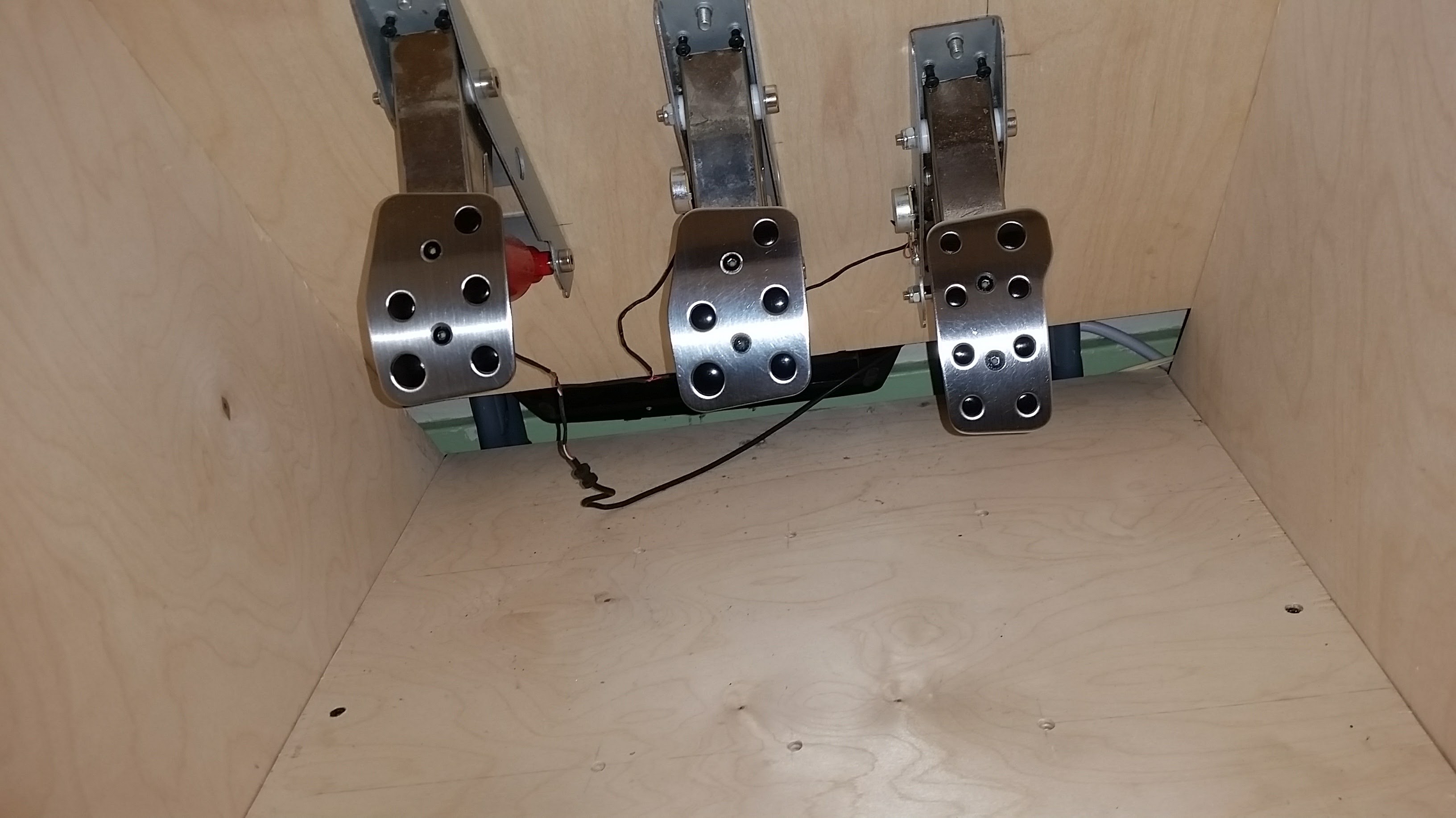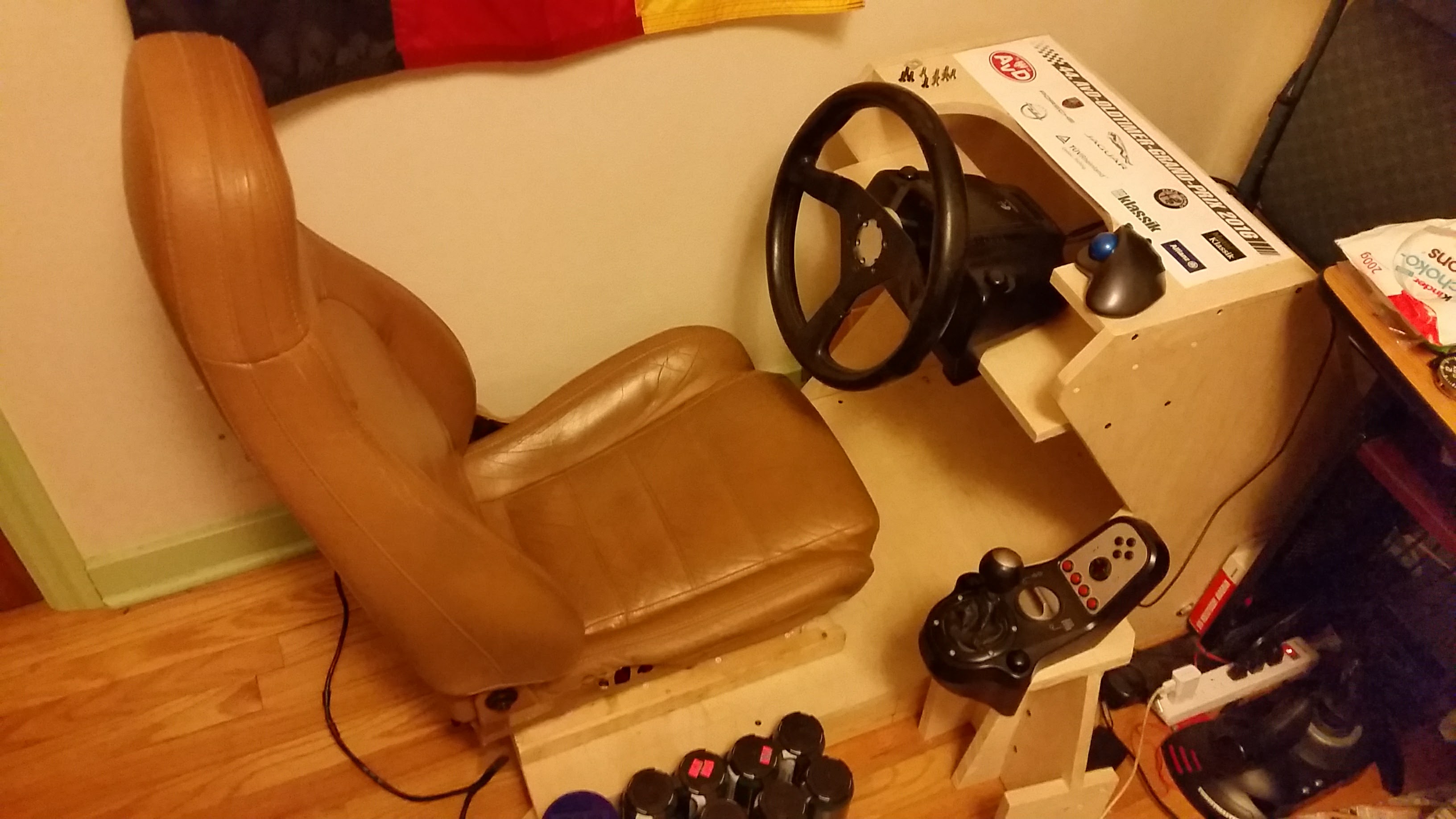 As designed, this should fit a Logitech G25 (though it shouldn't be hard to fit any modern wheel/pedals/shifter combination with some modification to how it mounts) with pedals either on the "floor" or (taken out of their plastic housing) upside-down against the front wall. The bolt holes are meant to approximate the positions of the pedals at rest in a Miata; if I were to do it again I would probably move them forward somewhat, as the G25 pedals have much less travel than the Miata pedals and feel a little unnatural as close to the driver as they are. Keep in mind, the Miata is a small car, and you may want to build yours slightly larger. I am around 5'9" (1.75m) tall and find it fits me well. As always, your mileage may vary.